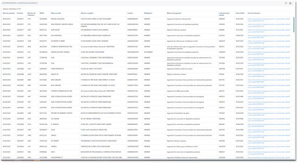 Identification à J+1 des entreprises clientes en procédure collective (source BODACC)